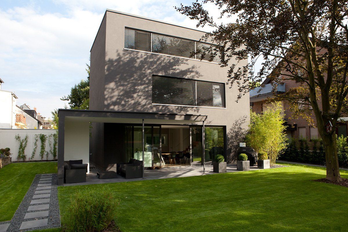 Das neue Haus wurde von dem Bauherren in das bestehende Wohngebiet eingefügt, hier entstand ein neues Grundstück durch die Abtrennung von einem großen Gartengrundstück. Das Gebäude sticht in seinen minimalistischen Formen aus der Umgebungsbebauung heraus: Ein schlichter, kubischer Baukörper wird lediglich durch eine zurückversetzte Eingangssituation und die aus der Grundform hervorspringende Terrassenüberdachung unterbrochen. Klare Formen widersprechen der verspielten Umgebung und ordnen das kleine Grundstück auch in der Gartenstruktur, die die Linien und Anmutung des Gebäudes wiederaufnimmt.