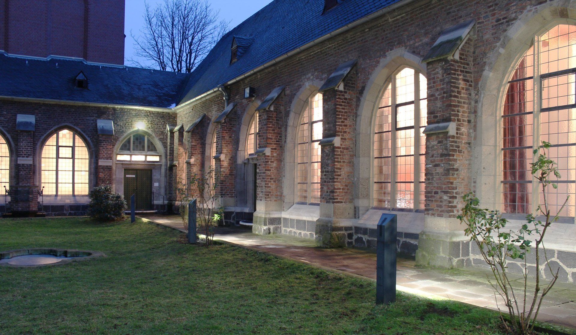 So wurde der Entschluss gefasst, der Tradition vieler historischer Gebäude in Köln zu folgen, nach der die Materialien der näheren Umgebung beim Bau der Gebäude Verwendung fanden. Der Boden des Kreuzgangsaales wurde im wilden Verband des Kreuzganges mit Mendiger Basalt verlegt, die Wände der WC – Anlagen mit großformatigen Schieferplatten aus der Eifel verkleidet, die aufwändigen Licht – und Schallinstallationen mit ihrer Steuerungstechnik für unterschiedliche Lichtszenarien in Kirche und Sälen in diesen Materialien integriert. Beim Abriss der verschiedenen Bodenbereiche wurden die Architekten im Kreuzgangsaal auch in Archäologischer Hinsicht fündig: Es wurde ein Fundament aus dem Mittelalter ausgegraben, welches sich mittig im Saal befindet. Dieses Fundament gibt Zeugnis über den ungewöhnlichen Namen „Kreuzgangsaal“. Waren zur Entstehungszeit des Klosters noch zwei benachbarte Kreuzgänge vorhanden,